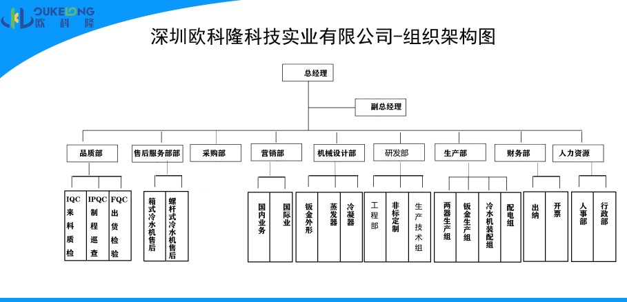 歐科隆制冷總經理辦公室下轄九大部門,分別為:品質部、售后服務部、采購部、營銷部、機械設計部、研發部、生產部、財務部、人力資源部。最高行政權、人事任免權為總經理所有。總經理下轄:銷售副總經理,副總經理。