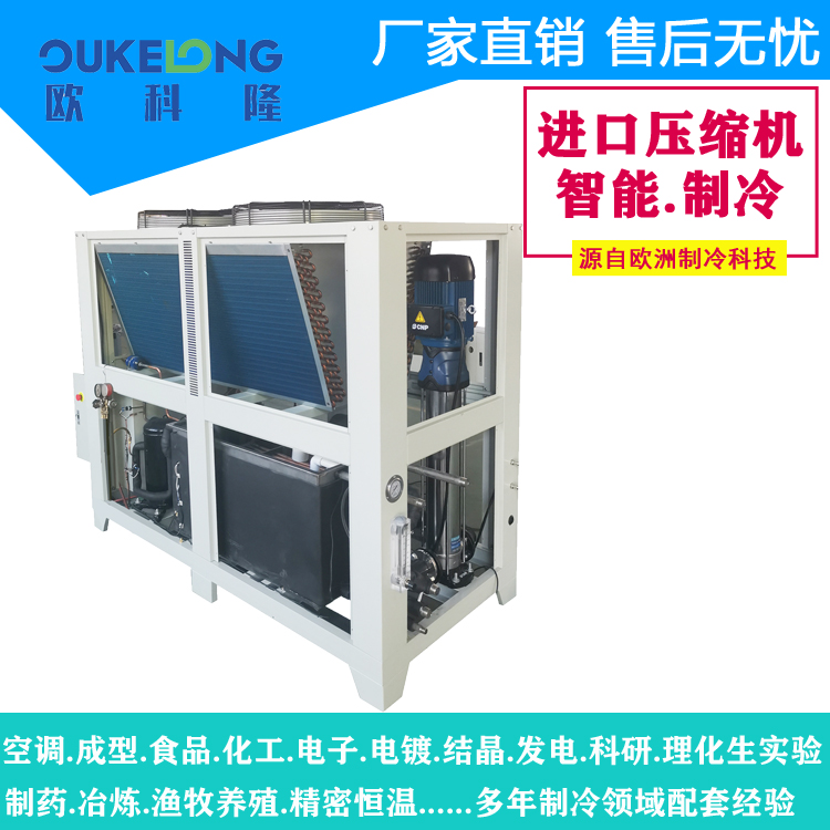 歐科隆15匹風冷式冷水機是一款高效節能的工業制冷設備,采用一體化設計,無需冷卻塔,安裝維護簡便。機組配備高性能渦旋壓縮機(可選谷輪/比澤爾品牌),制冷量達52kW,溫度控制范圍5℃~30℃,精度±1℃。