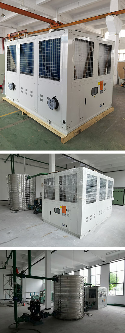 本案為東風二汽公司風冷螺桿式冷水機使用現場,主機裝機容量110匹,水箱容量5立方,配備內外循環水泵兩用兩備。